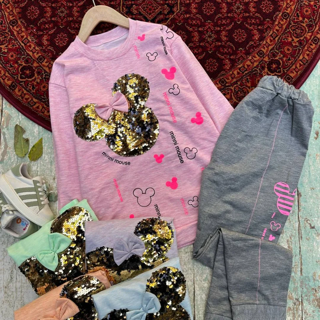 بولیزشلوار ست دخترانه جنس ملانژ نوبافت درجه ۱ طرح میکی پولکی سایز ۶۰